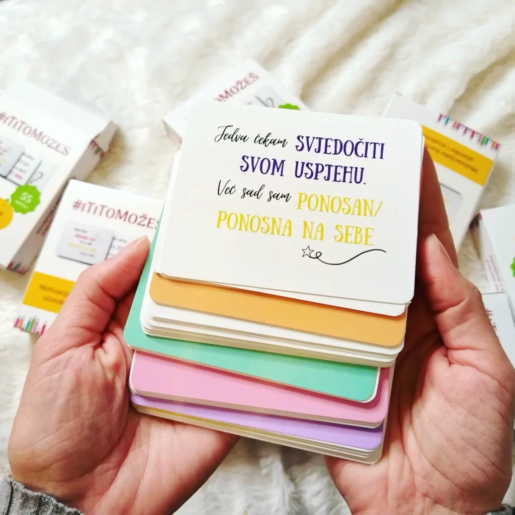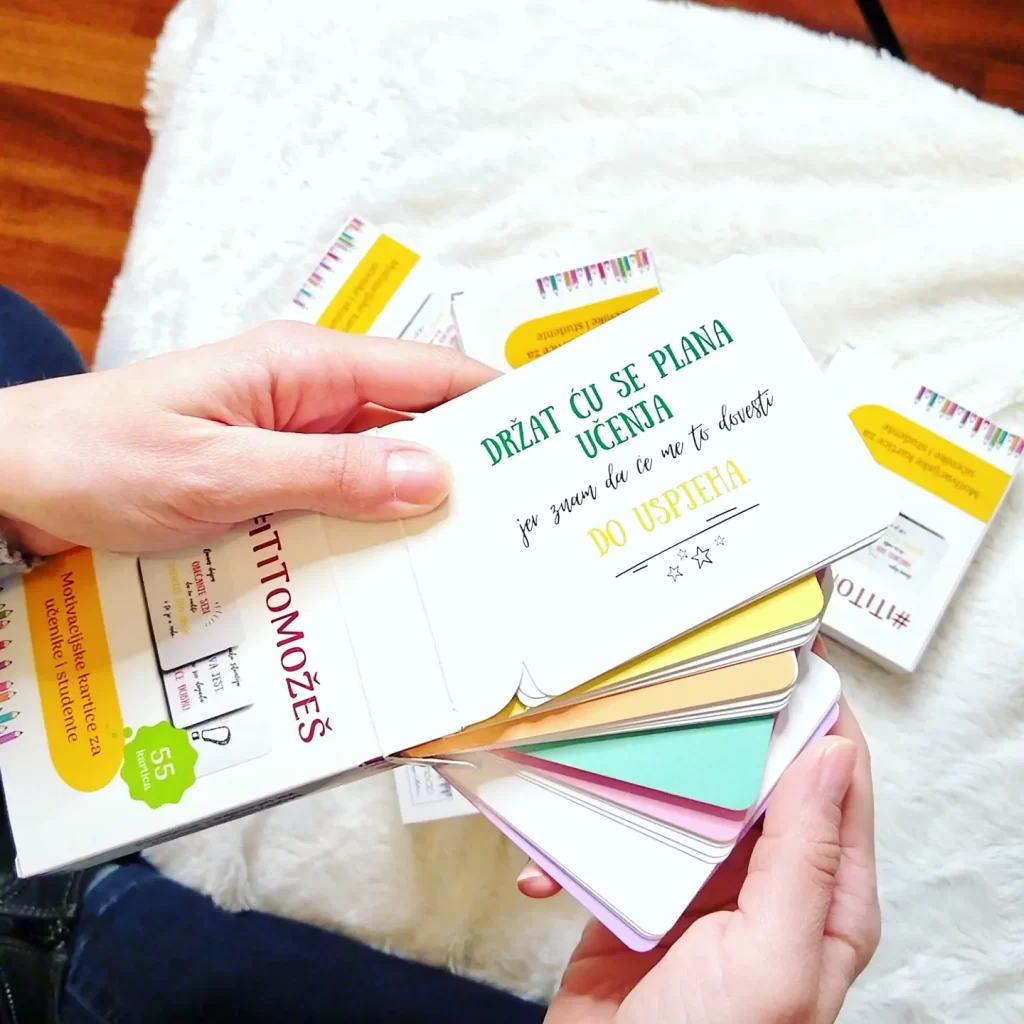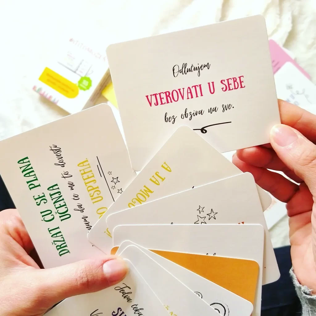 Ove kartice napravljene su upravo s tom namjerom! Svaka od njih sadrži jednu pozitivnu misao, rečenicu i poruku koju ćete nositi sa sobom kad god vam je potrebno. Prije ispita, za vrijeme učenja, za vrijeme javnog izlaganja, kartice će vas podsjetiti tko ste zaista i što sve možete!